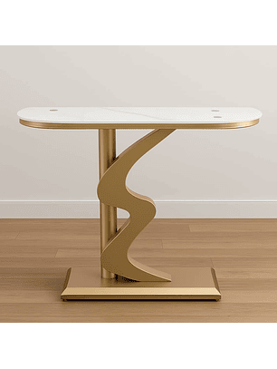 Set Manicura Mónaco Mesa de Piedra Sinterizada y Silla Tejida Patas Doradas Rosada y Beige